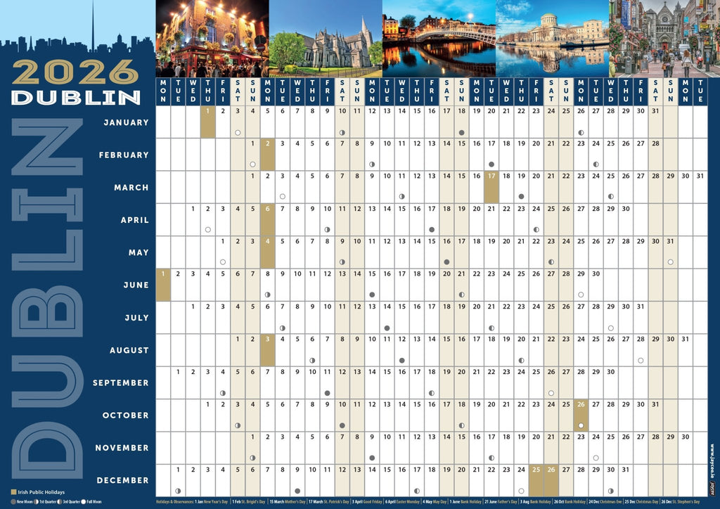 Dublin branded twelve month planner with Irish public holidays and Moon phase icons.