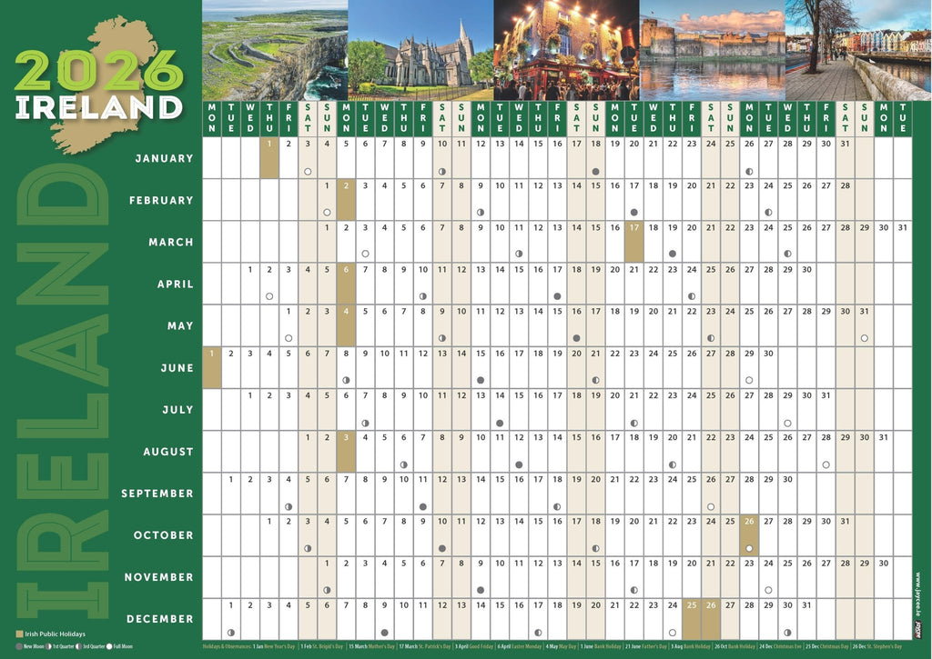 Ireland branded twelve month planner with Irish public holidays and Moon phase icons.
